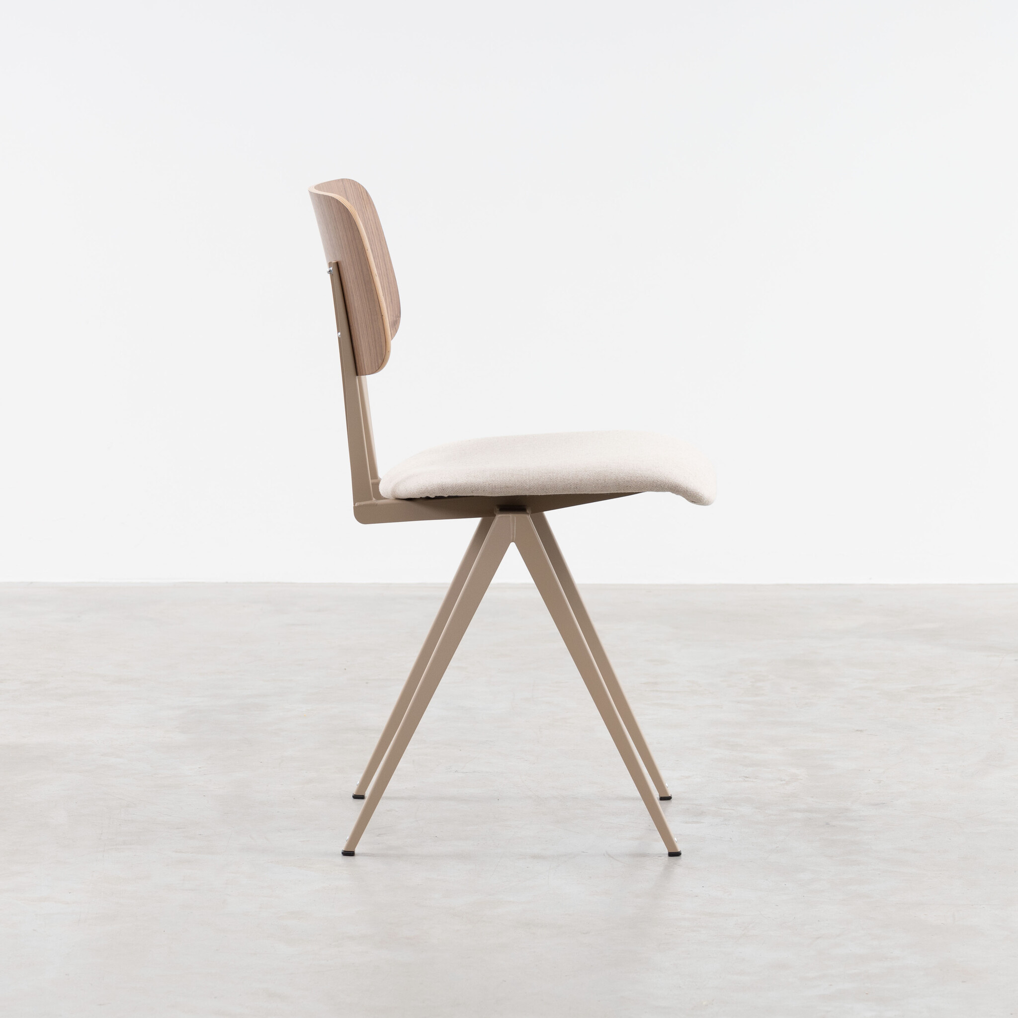 Materiaal: frame gemaakt van gevouwen plaatstaal. Zitting gestoffeerd. Rugleuning gemaakt van gelakt walnoot fineer.