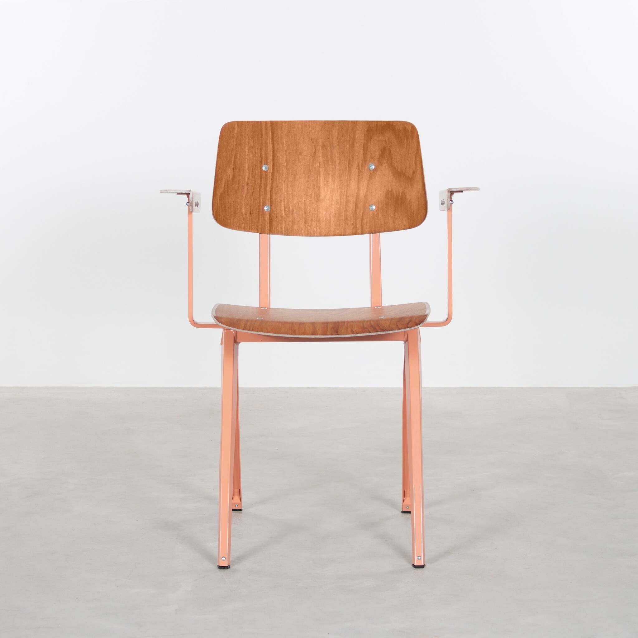 De stoel werd eind jaren ’50, begin jaren ’60 ontworpen en geproduceerd door Galvanitas in Oosterhout. In plaats van de gebruikelijke buisconstructie, koos de ontwerper voor een frame van geperst plaatstaal. Een zeer solide en tegelijkertijd revolutionair ontwerp voor die tijd. De stoel is speciaal ontworpen voor intensief gebruik in openbare gebouwen zoals scholen, instellingen en kantines.