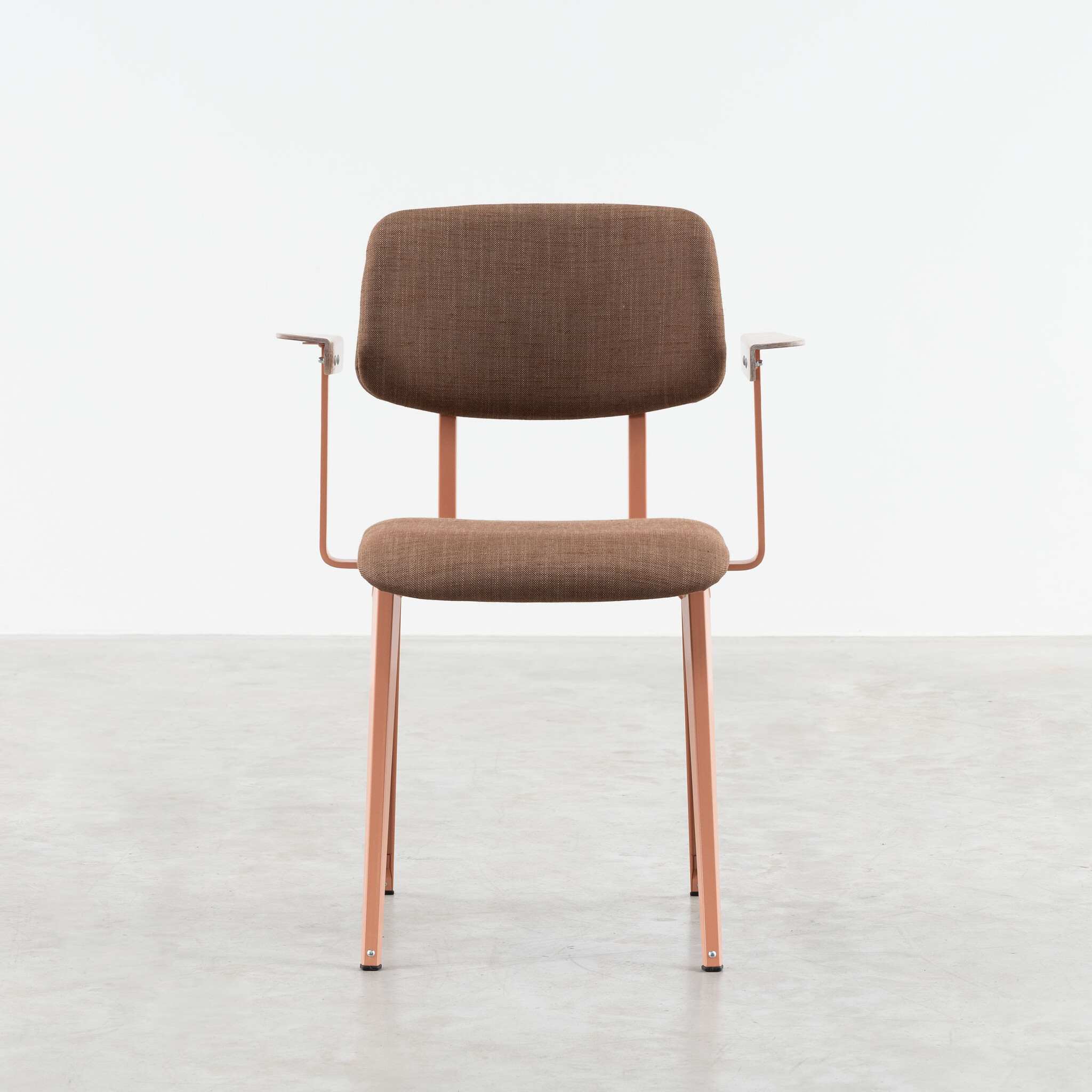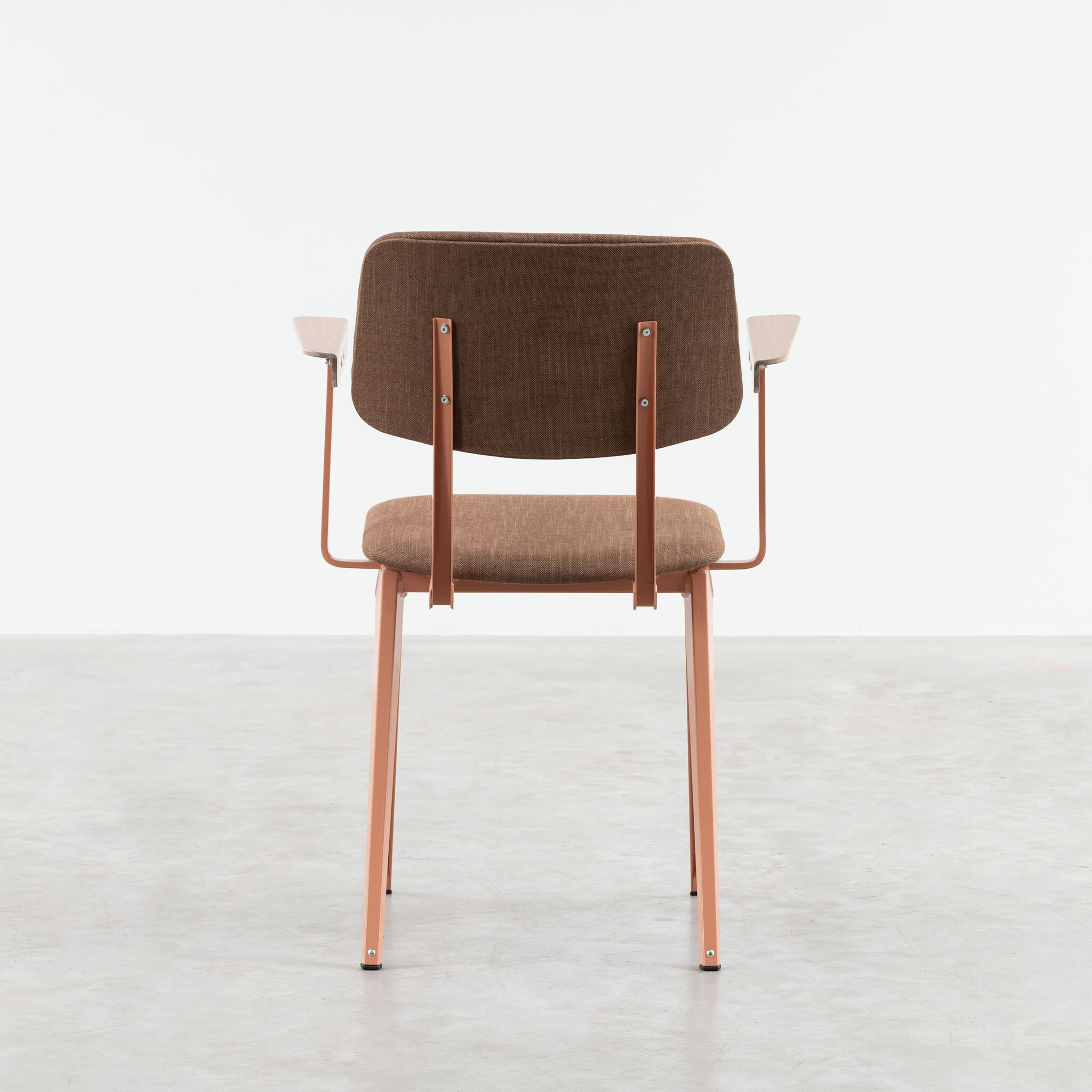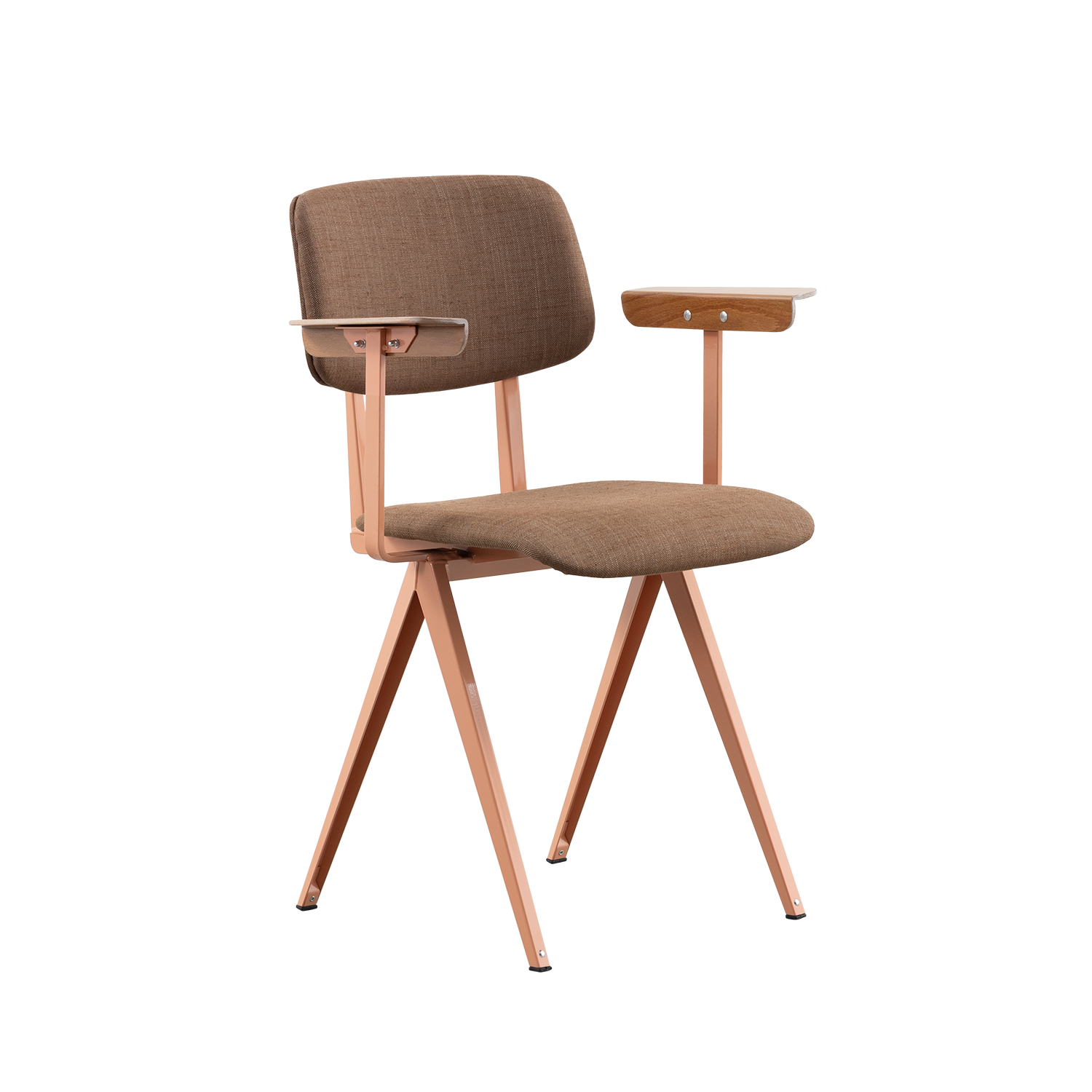Materiaal: frame gemaakt van gevouwen plaatstaal. Zitting en rugleuning gestoffeerd. Armleggers gemaakt van kunsthars plywood hout.