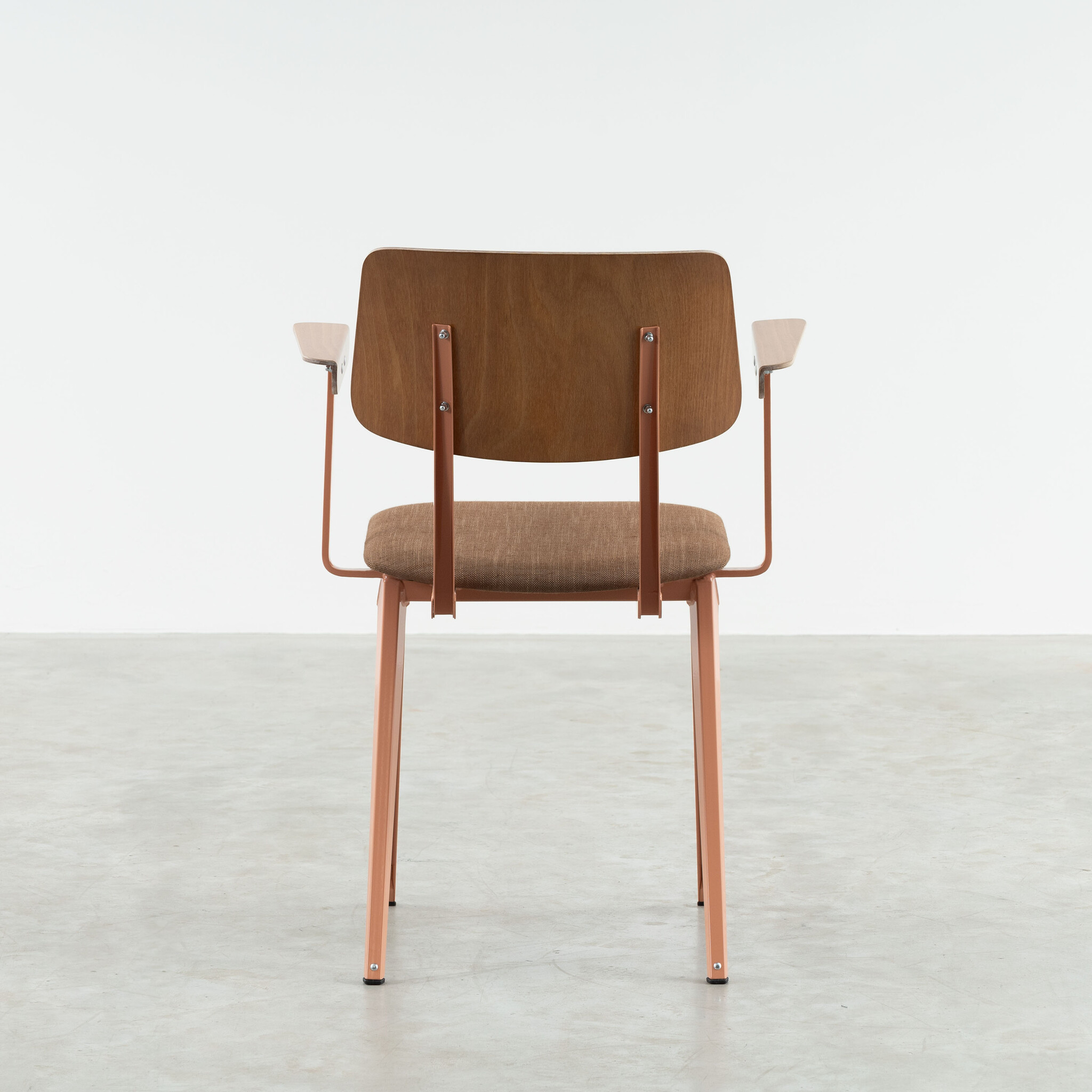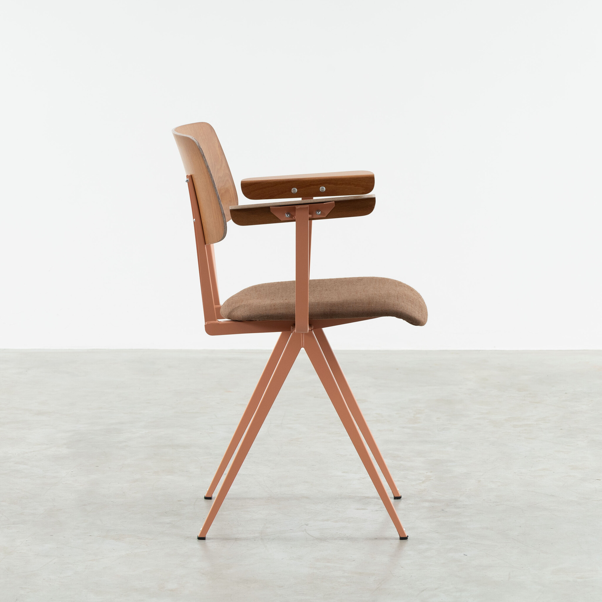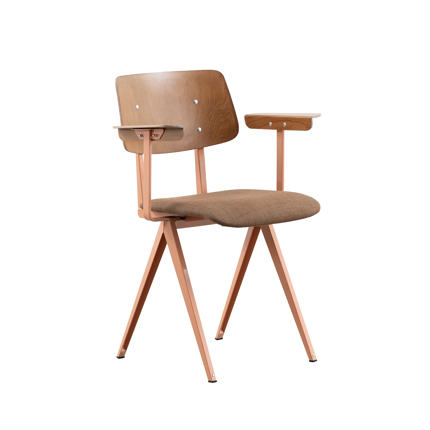 Materiaal: frame gemaakt van gevouwen plaatstaal. Zitting gestoffeerd. Armleggers & rugleuning gemaakt van kunsthars plywood hout.