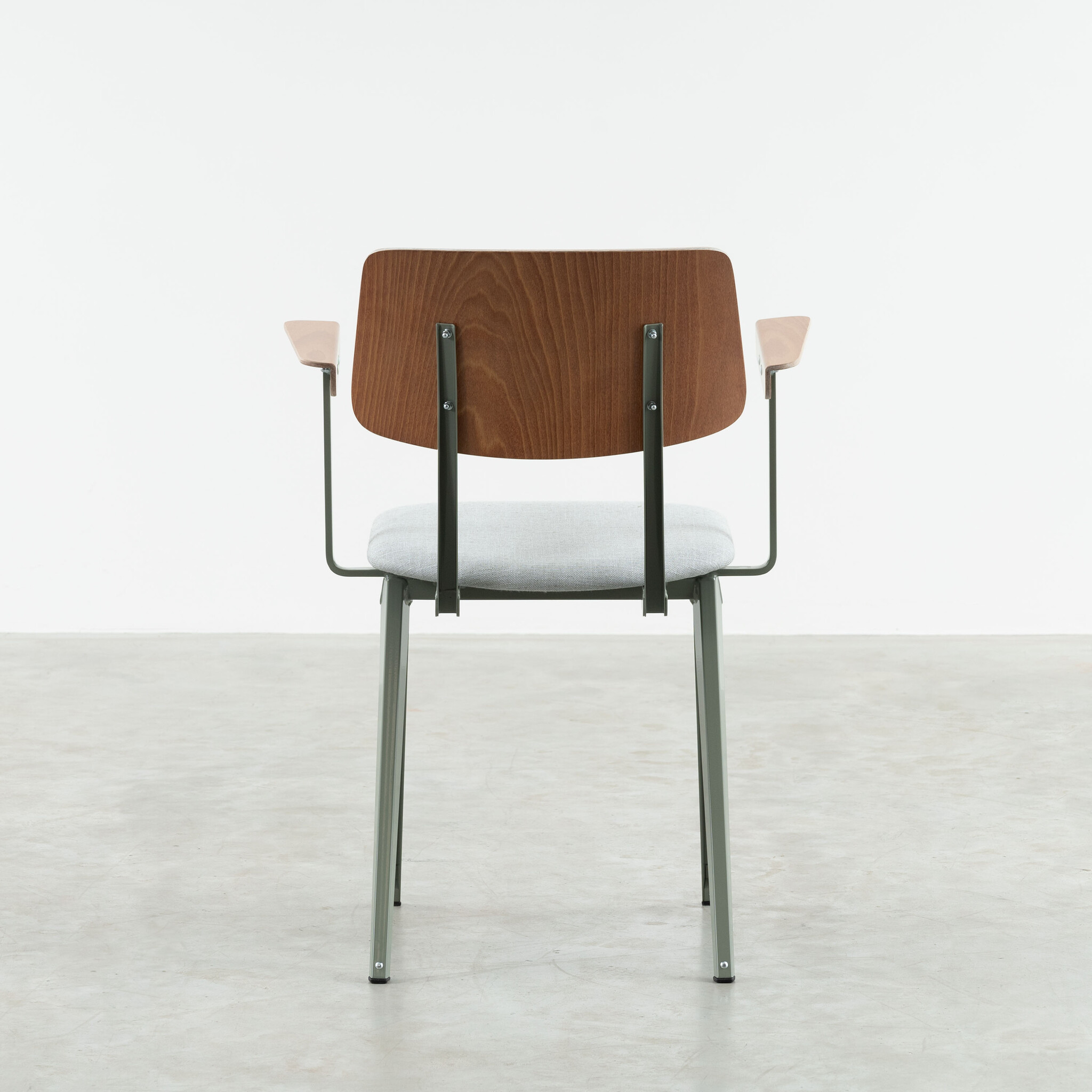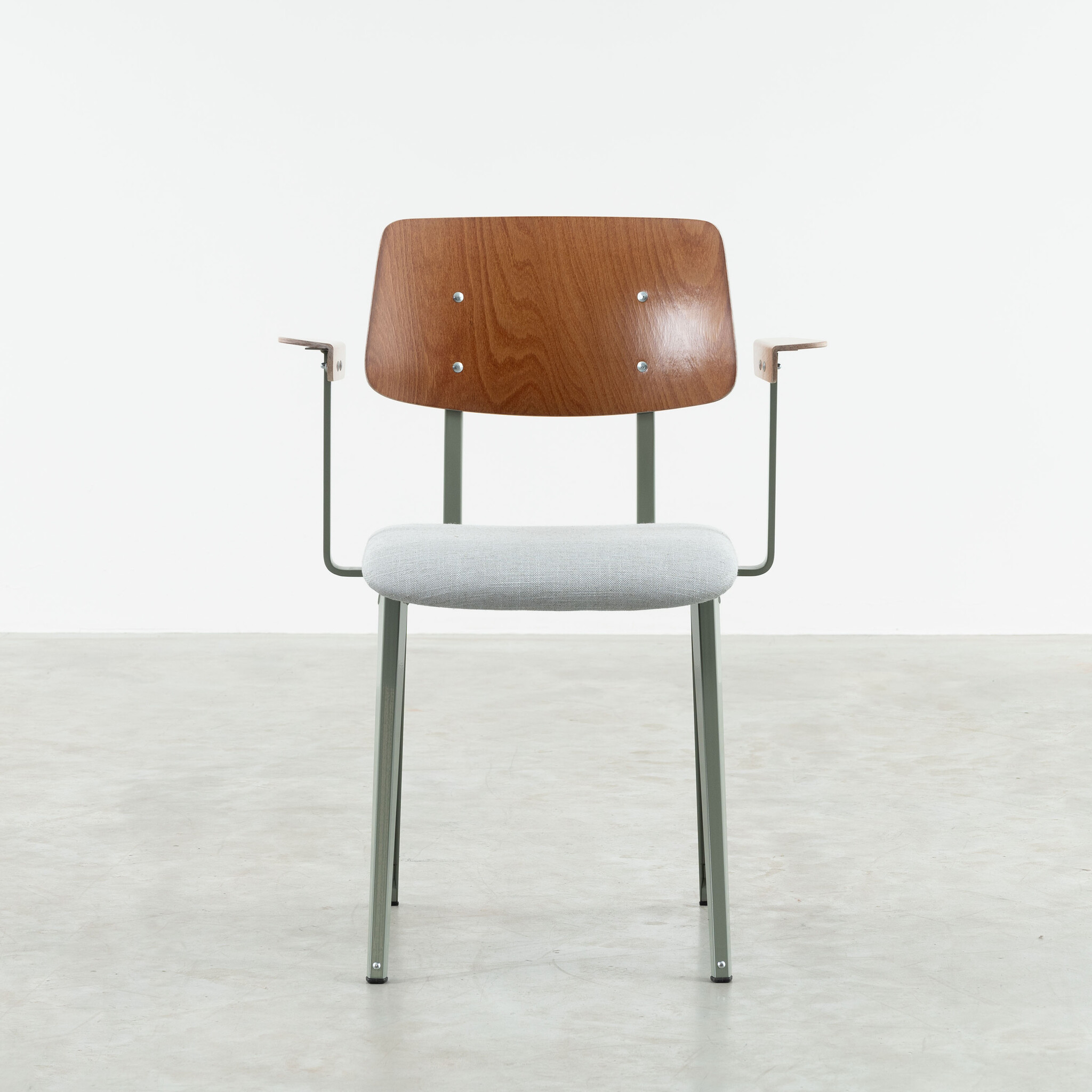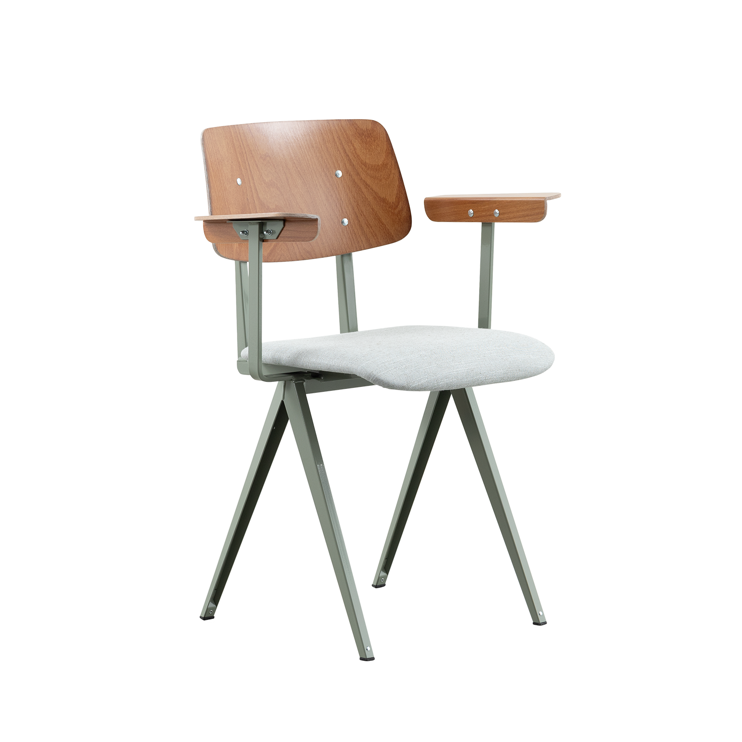 Materiaal: frame gemaakt van gevouwen plaatstaal. Zitting gestoffeerd. Armleggers & rugleuning gemaakt van kunsthars plywood hout.