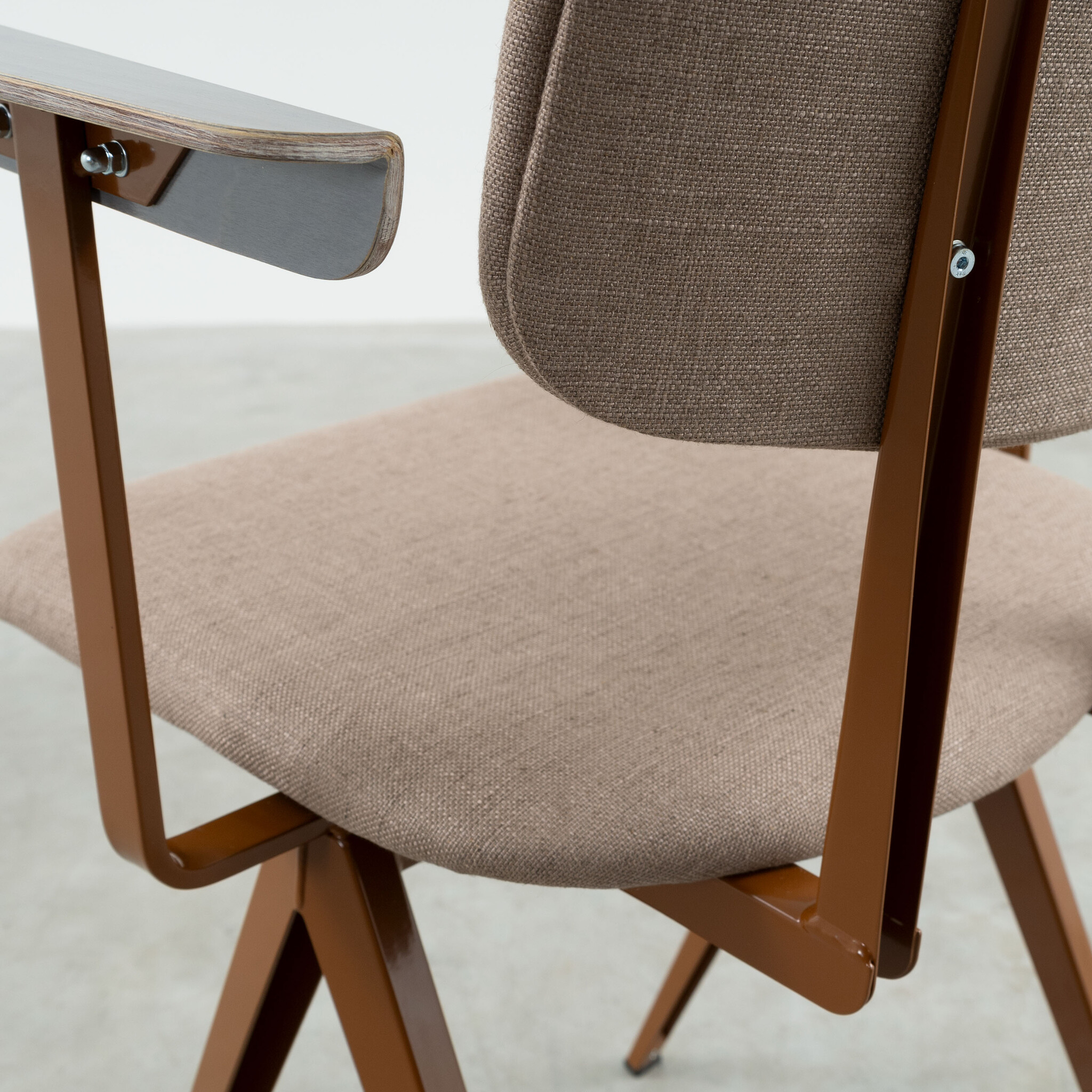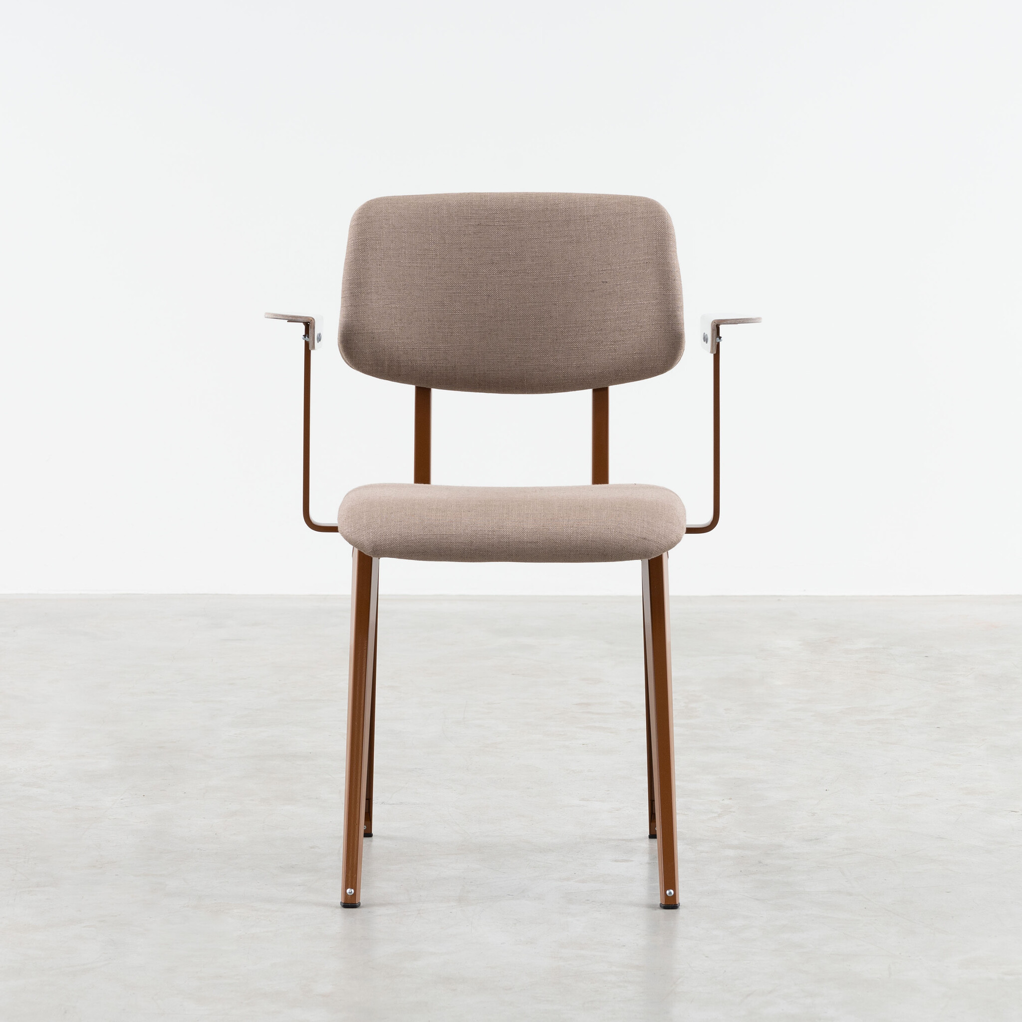 Materiaal: frame gemaakt van gevouwen plaatstaal. Zitting en rugleuning gestoffeerd. Armleggers gemaakt van kunsthars plywood hout.