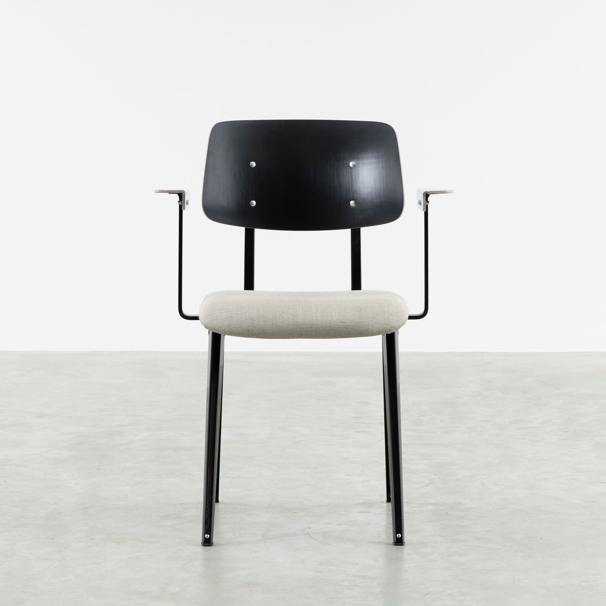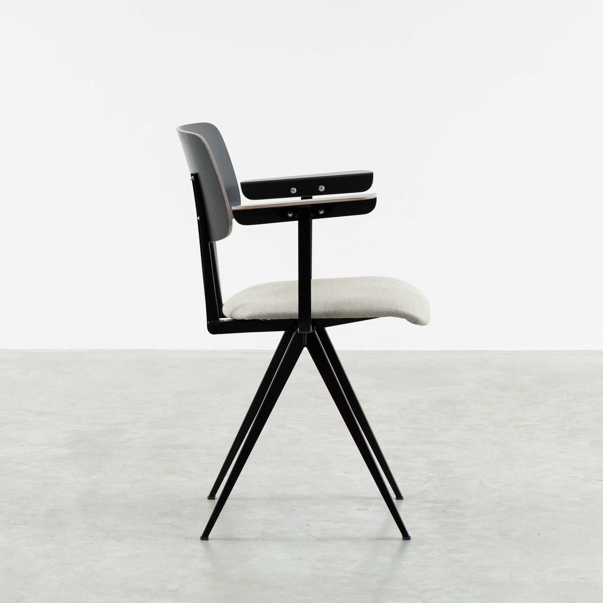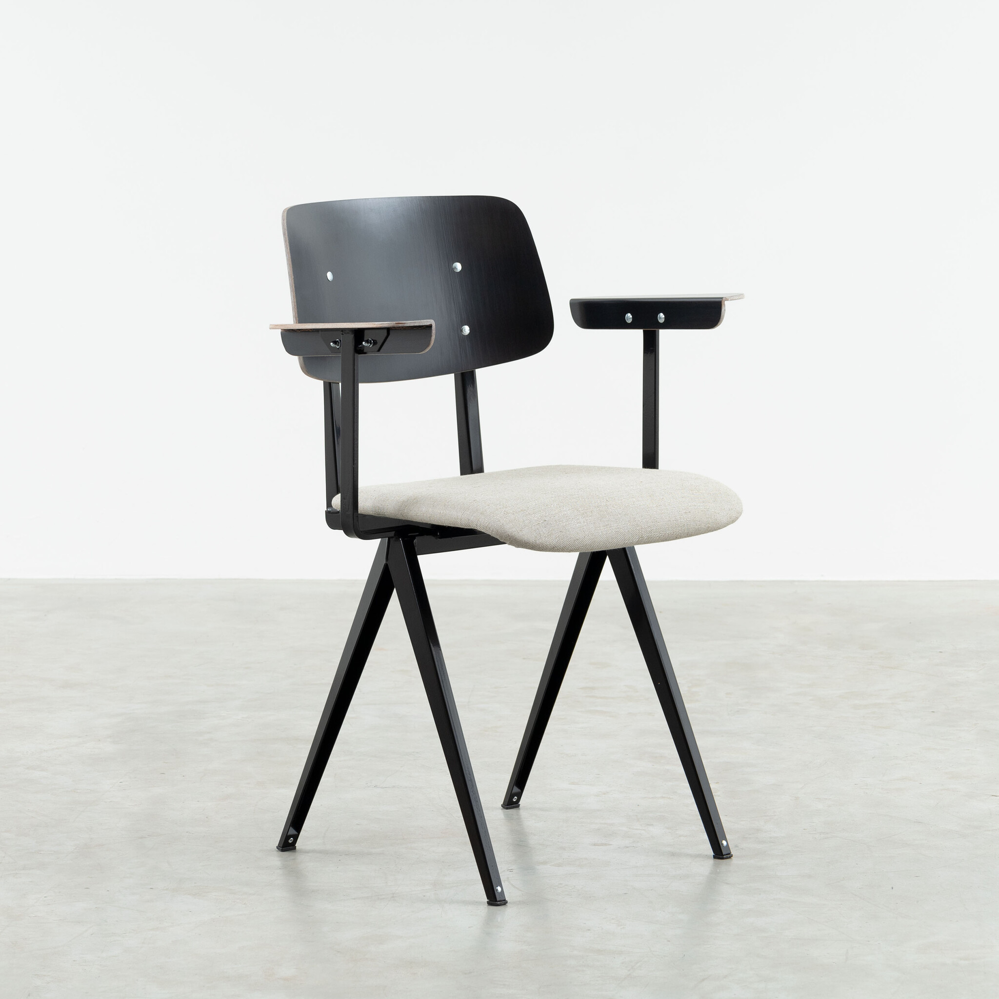 Materiaal: frame gemaakt van gevouwen plaatstaal. Zitting gestoffeerd. Armleggers & rugleuning gemaakt van kunsthars plywood hout.