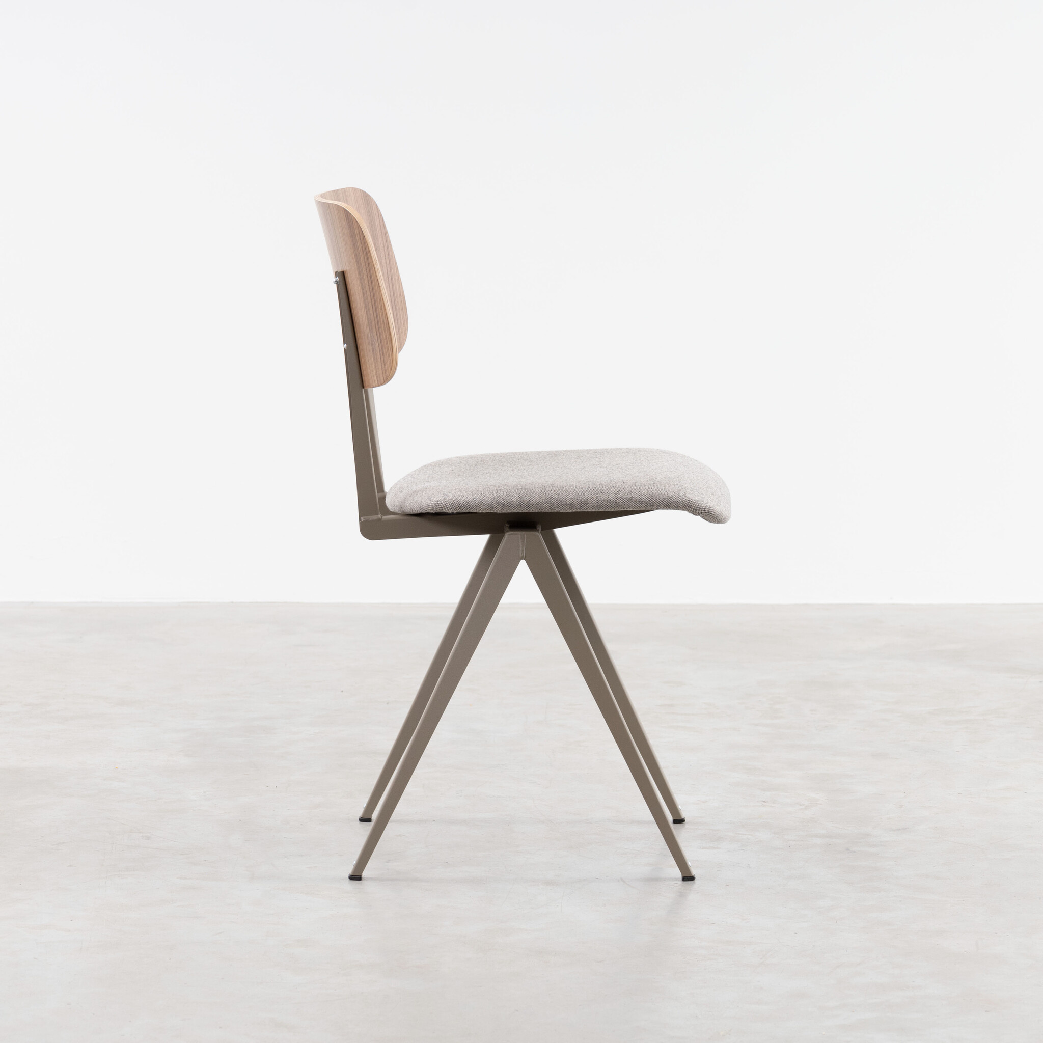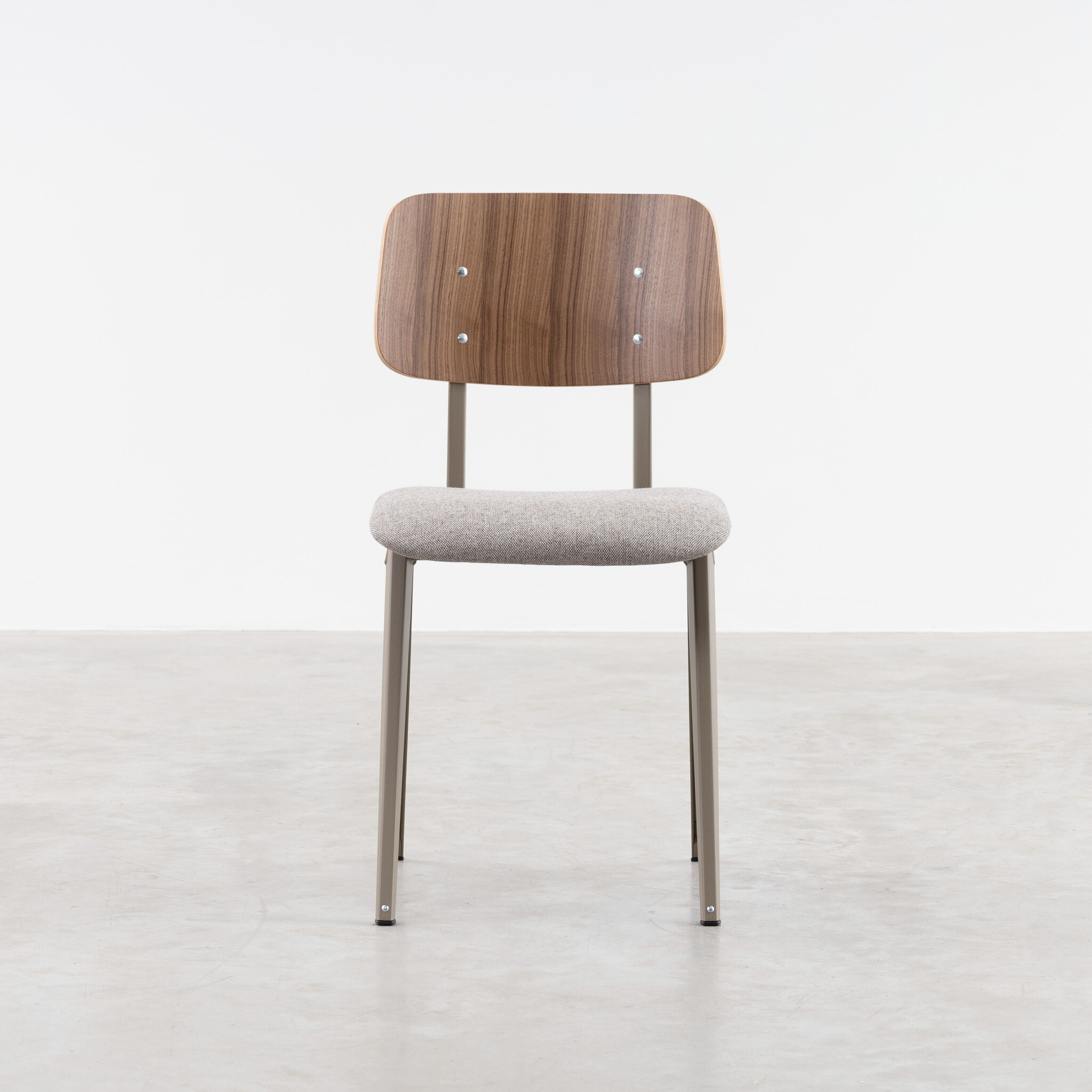 Materiaal: frame gemaakt van gevouwen plaatstaal. Zitting gestoffeerd. Rugleuning gemaakt van gelakt eiken fineer.