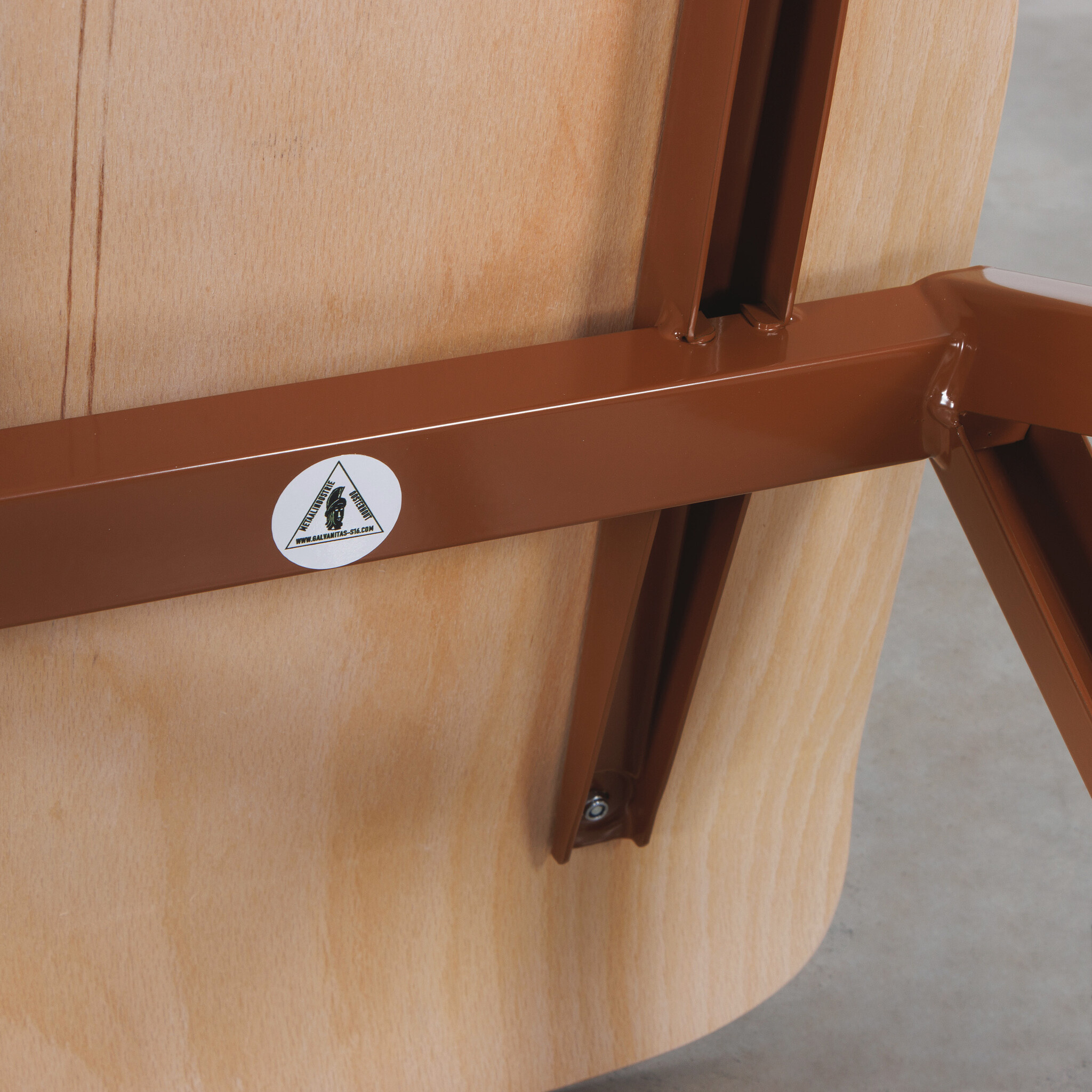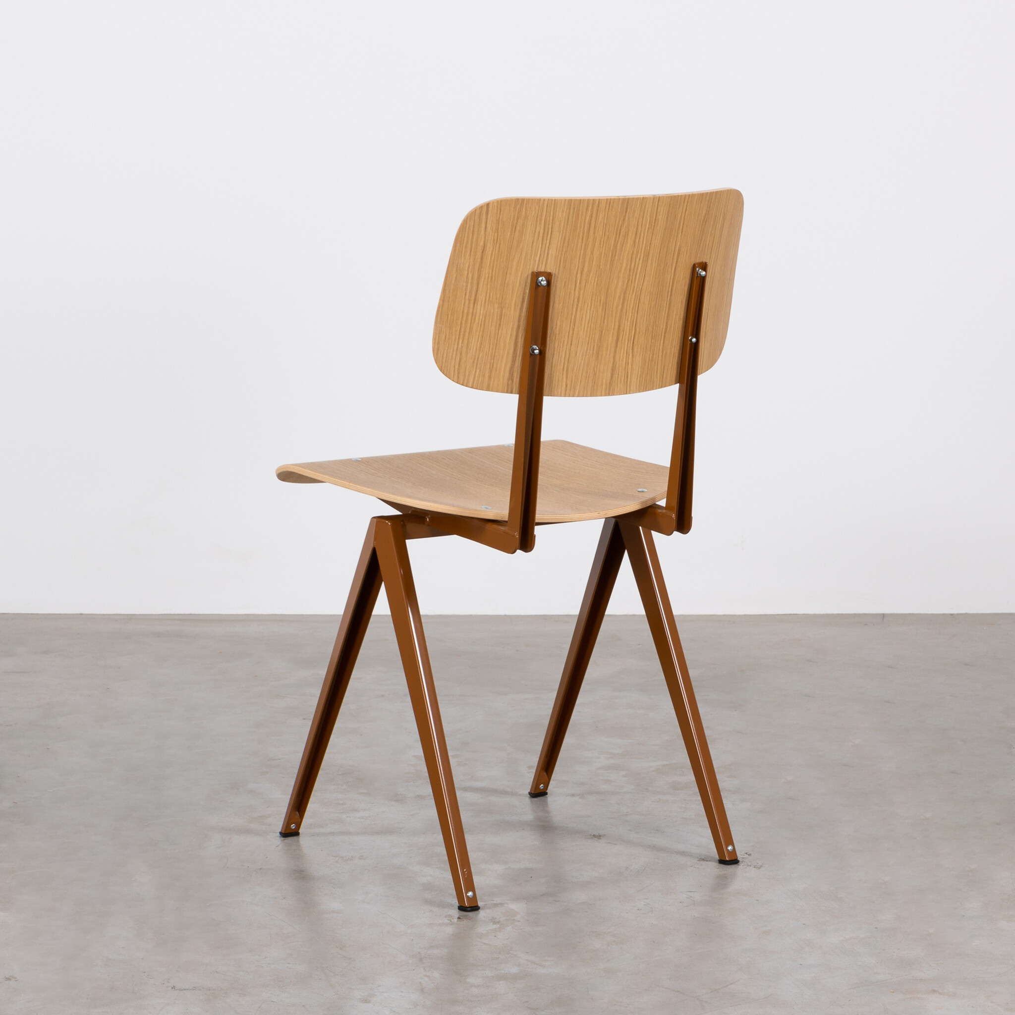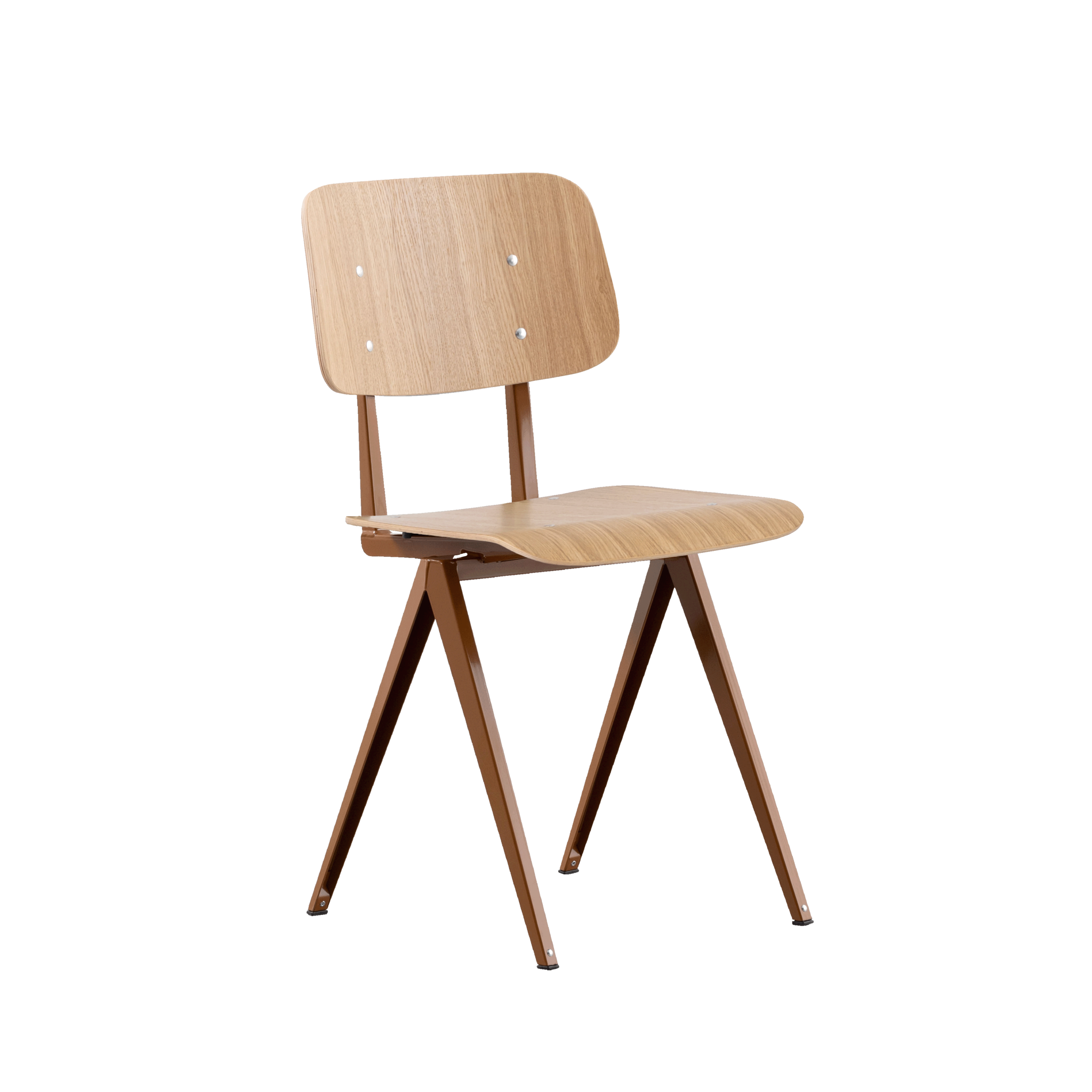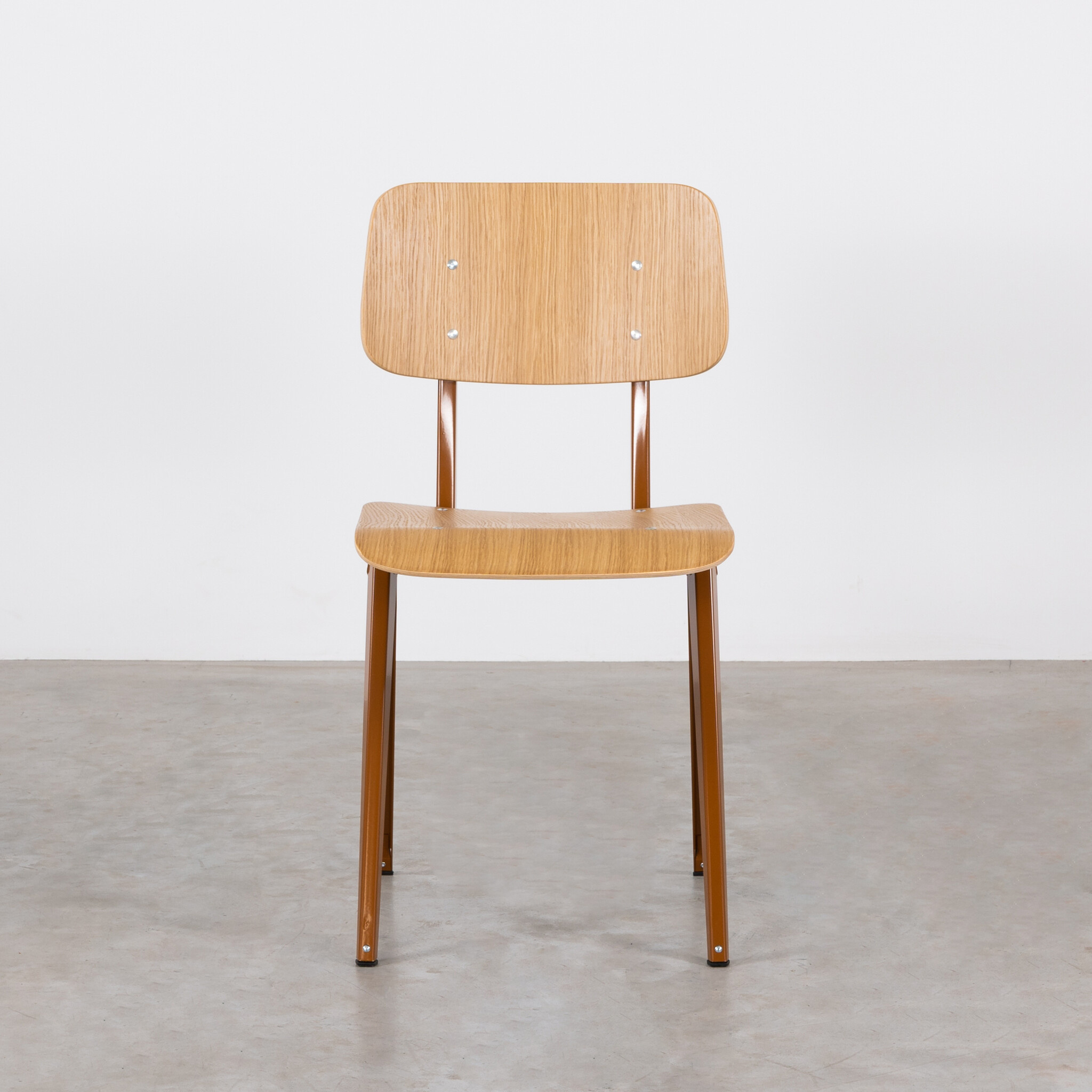 Materiaal: frame gemaakt van gevouwen plaatstaal. Rugleuning en zitting gemaakt van gelakt eiken fineer.