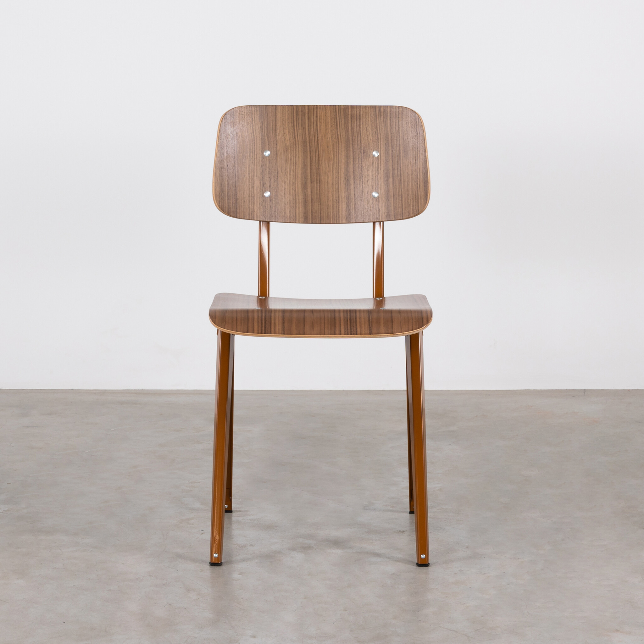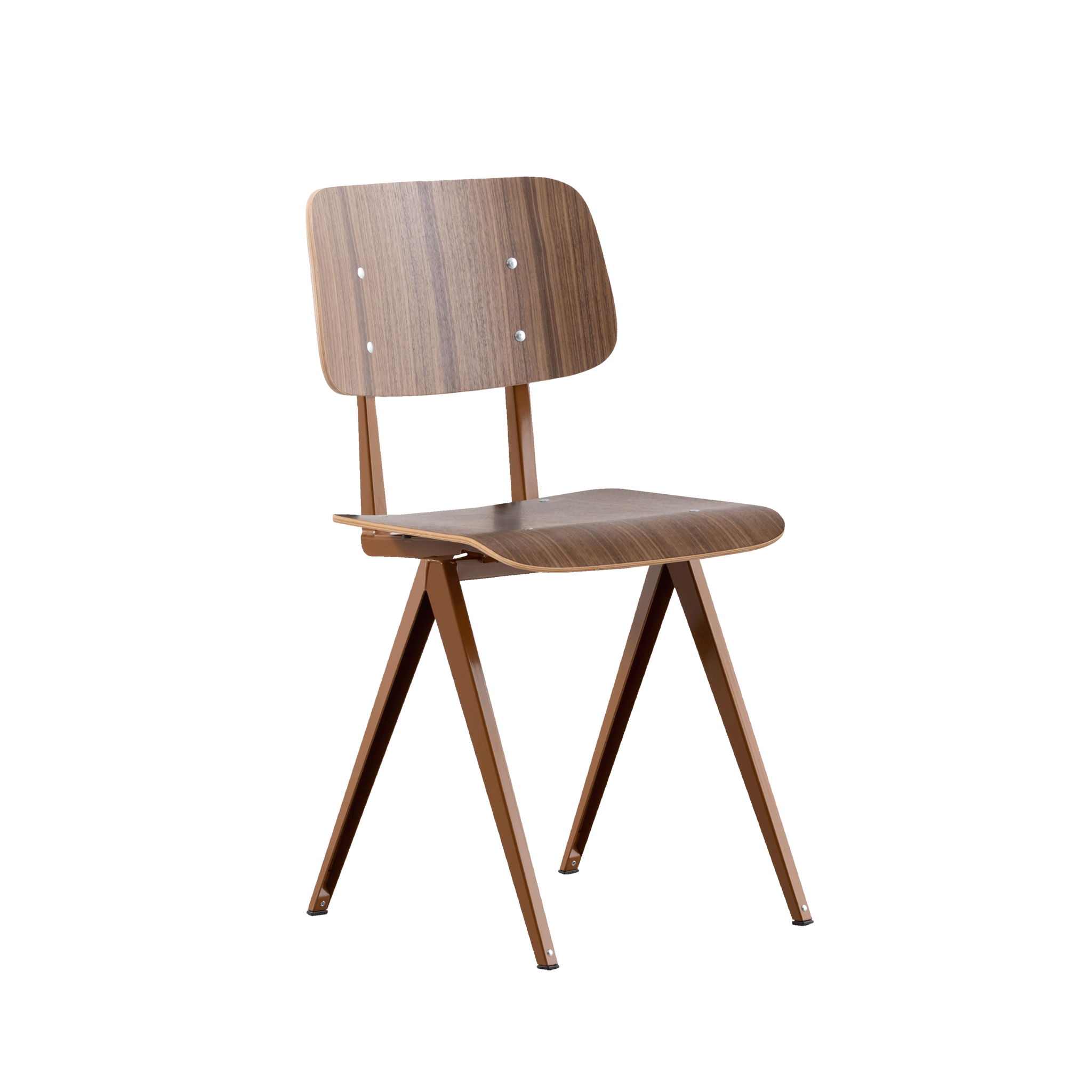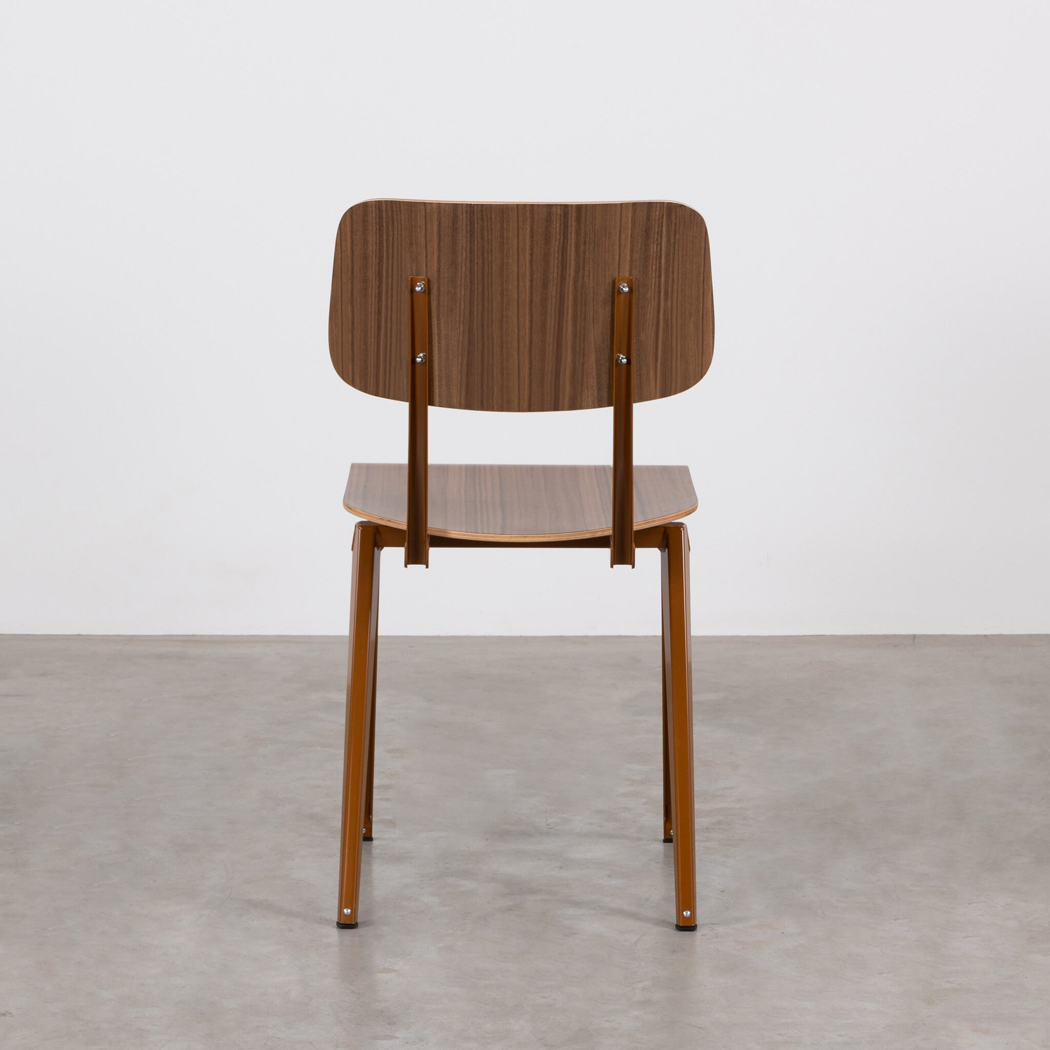 Materiaal: frame gemaakt van gevouwen plaatstaal. Rugleuning en zitting gemaakt van gelakt walnoot fineer.