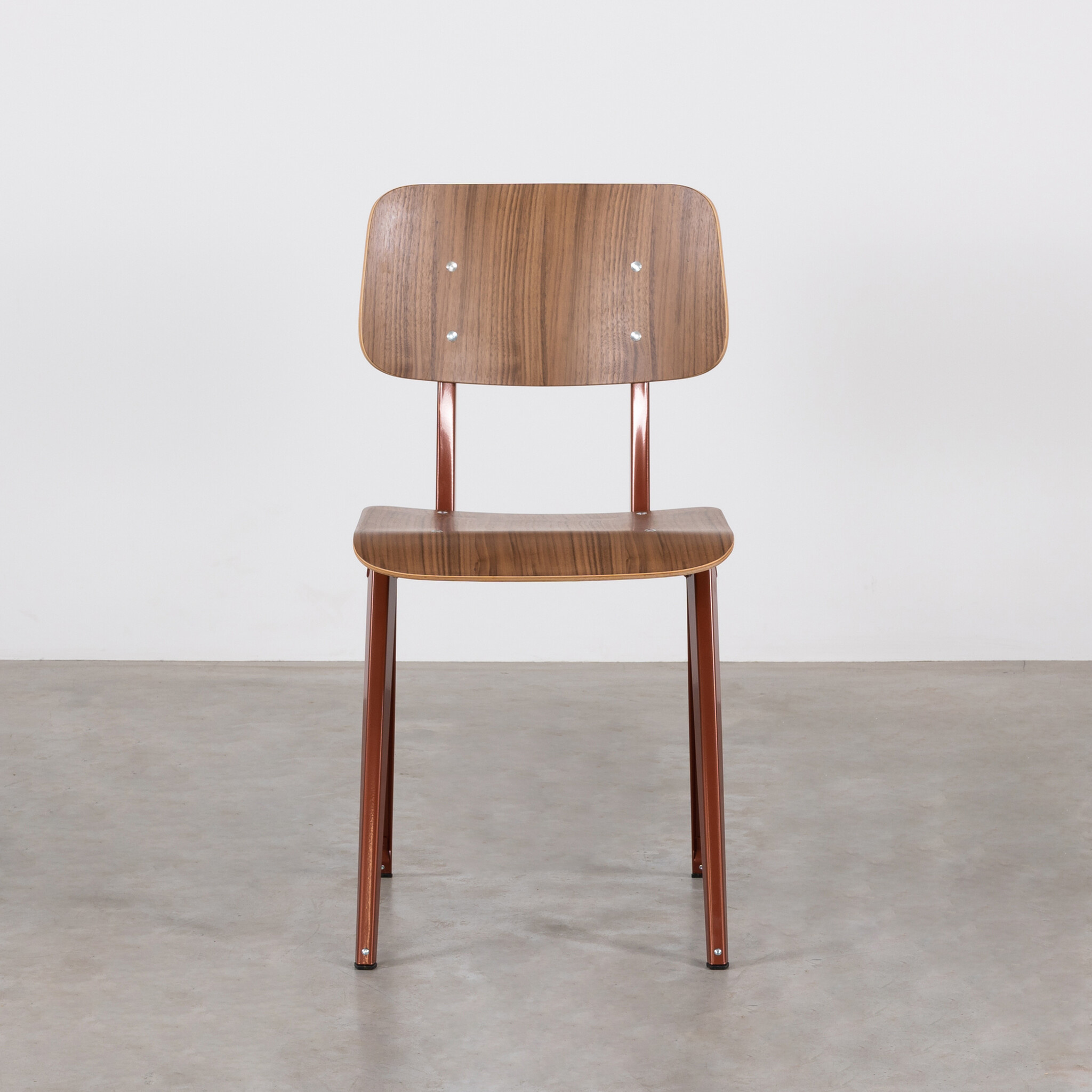 Materiaal: frame gemaakt van gevouwen plaatstaal. Rugleuning en zitting gemaakt van gelakt walnoot fineer.