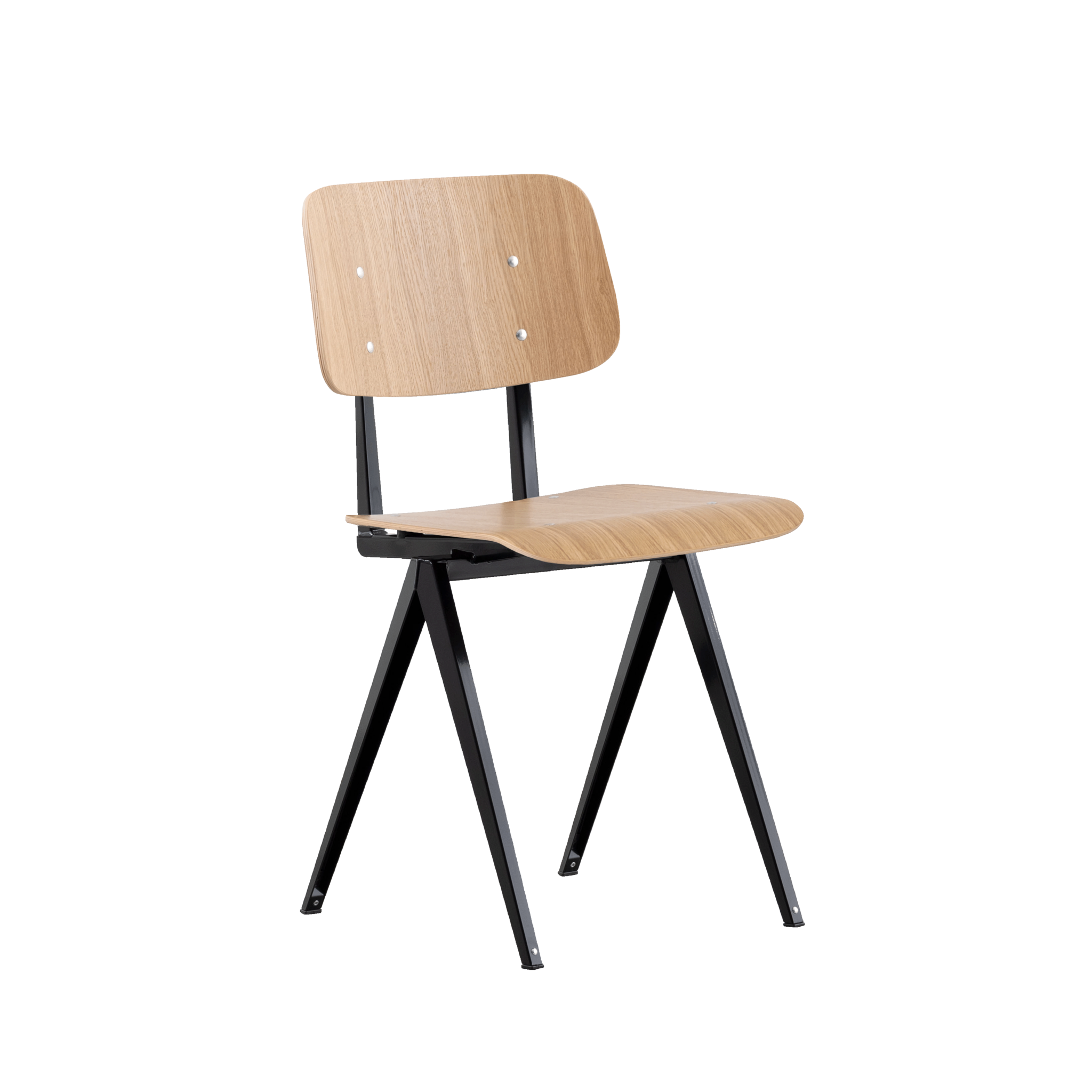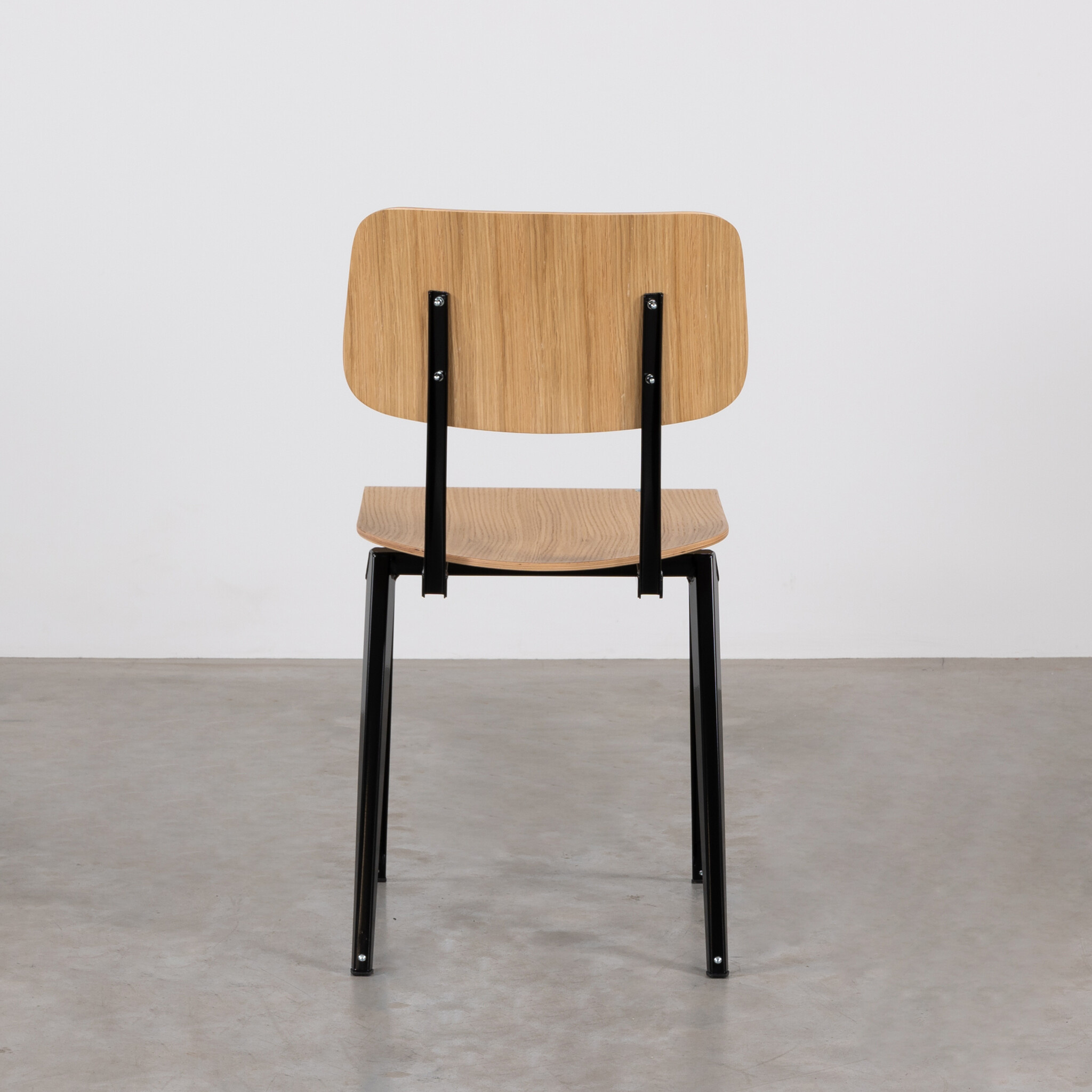 Materiaal: frame gemaakt van gevouwen plaatstaal. Rugleuning en zitting gemaakt van gelakt eiken fineer.