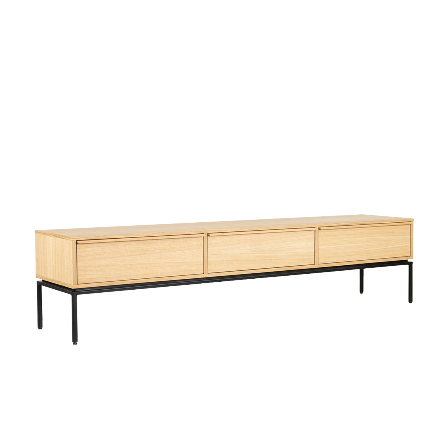 Het tv-meubel heeft drie compartimenten. De massief houten grepen zijn zo breed als de fronten. Natuurlijk heeft ook deze kast een strak, zwart metalen frame. En wat voor alle Tempelman kasten geldt: het overbodige is weggelaten, het ontwerp draait om pure lijnvorming.