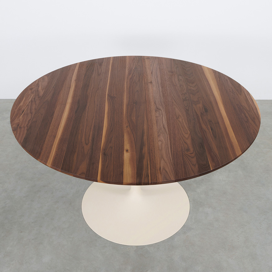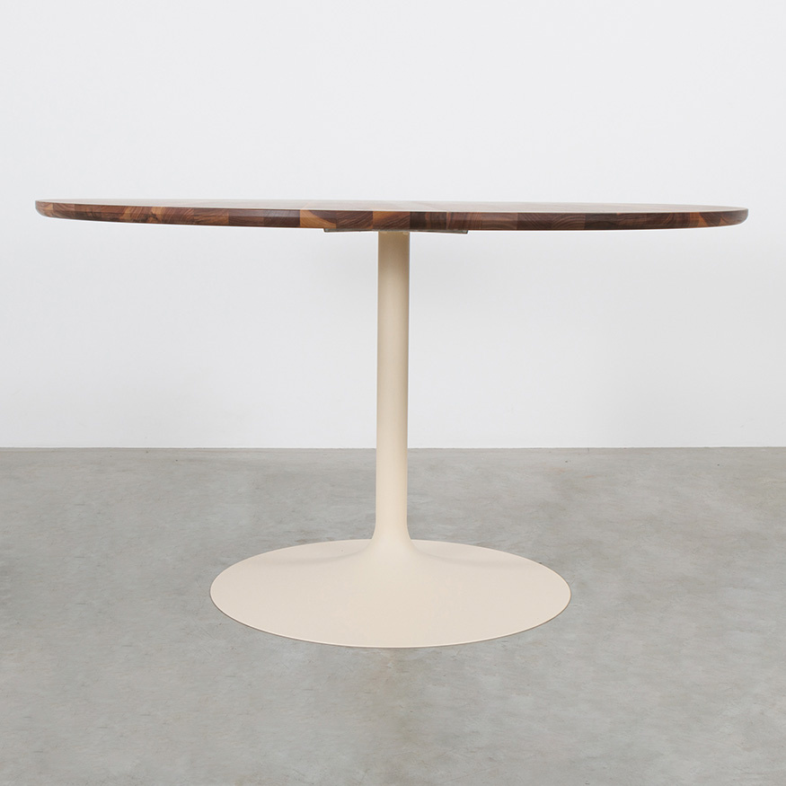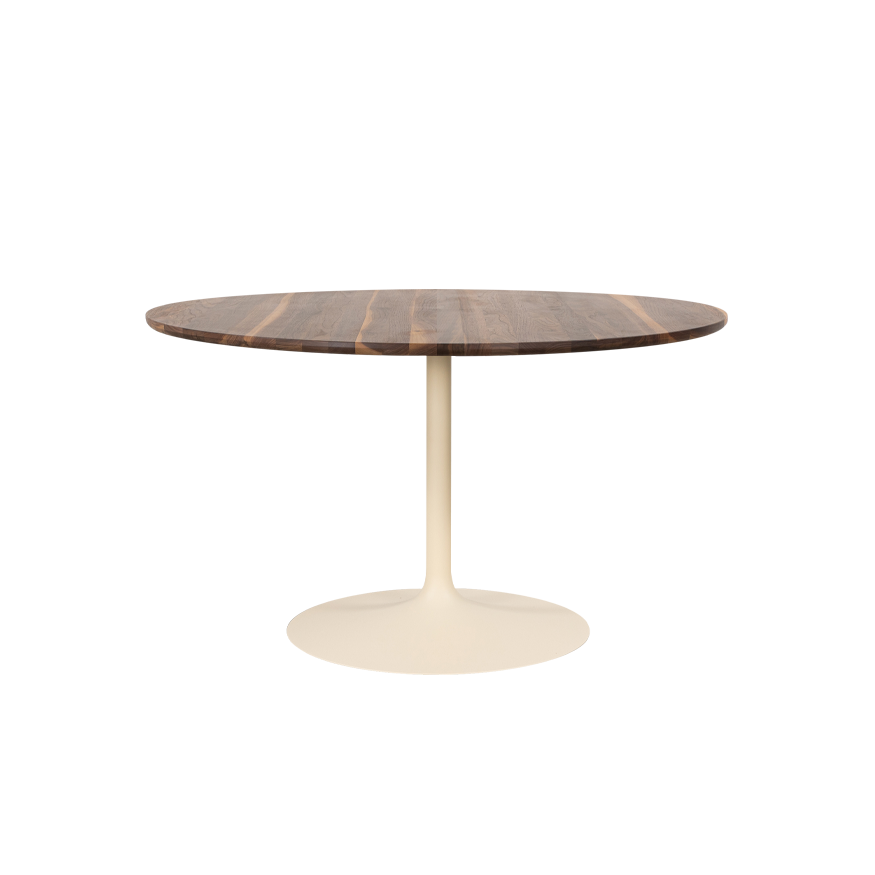 Tafel Tinne heeft een rond blad van massief hout en een slanke trompetvoet. Het ontwerp is modern en rustig, met sterke materialen en een stabiele basis. Het houten blad geeft de tafel een warme uitstraling. De poot is leverbaar in twee kleuren, zodat je de tafel goed kunt laten aansluiten op je interieur.