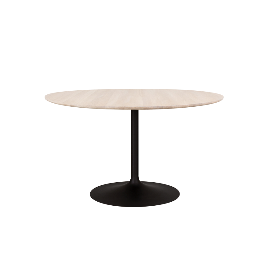 Tafel Tinne heeft een rond blad van massief hout en een slanke trompetvoet. Het ontwerp is modern en rustig, met sterke materialen en een stabiele basis. Het houten blad geeft de tafel een warme uitstraling. De poot is leverbaar in twee kleuren, zodat je de tafel goed kunt laten aansluiten op je interieur.