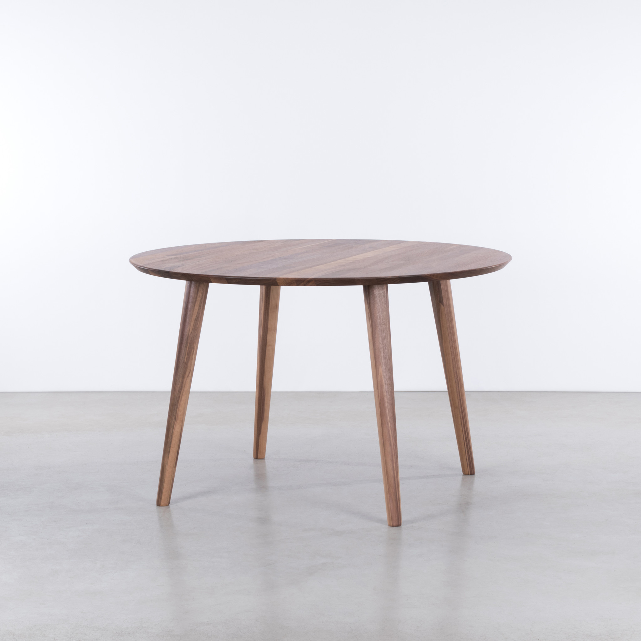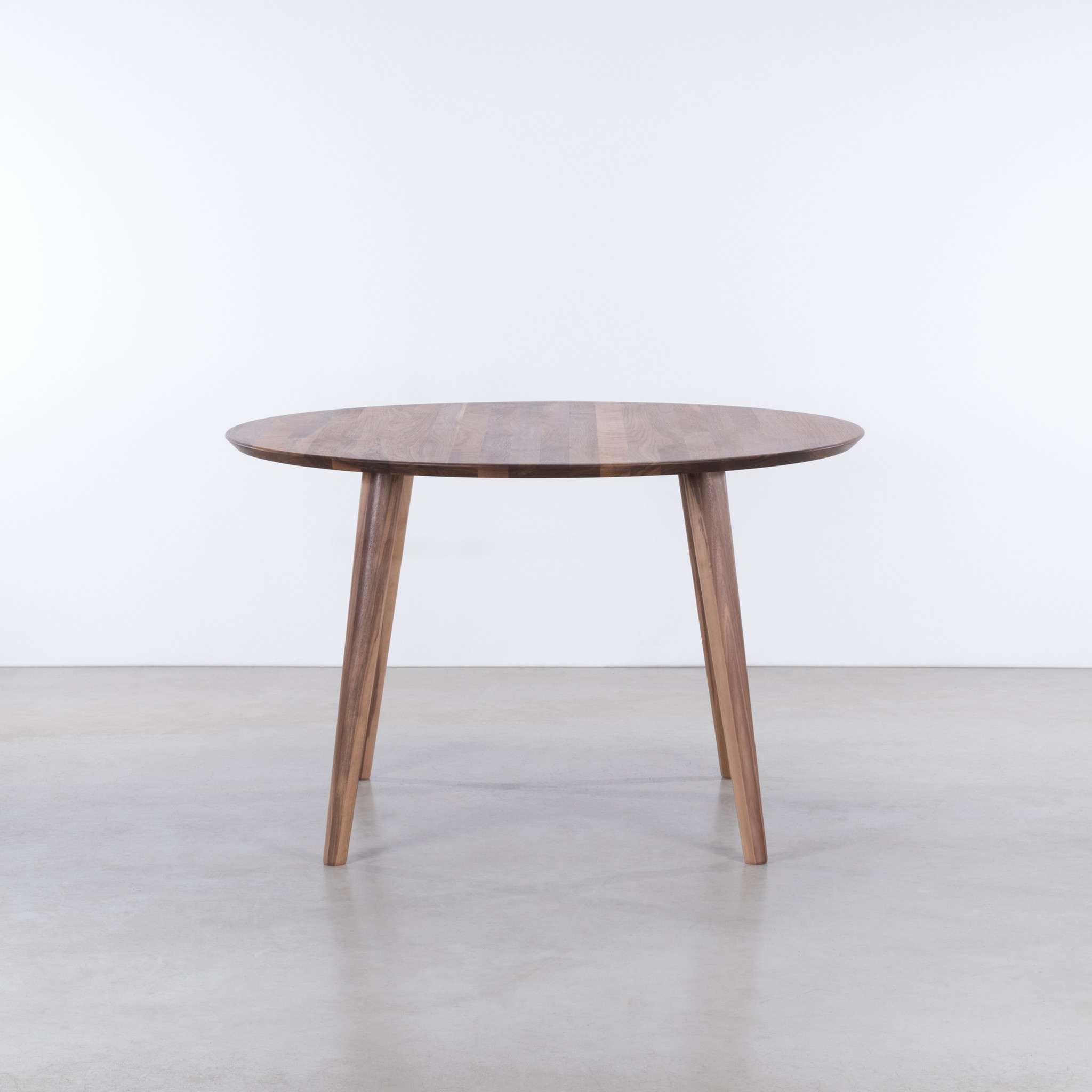 De Tomrer is een massief houten tafel in de Deense stijl van de jaren ’60. Een retro tafel met een frisse uitstraling. De combinatie van de ranke constructie met het slanke blad geeft deze eettafel een licht en zachte uitstraling. Het tafelblad is aan de kopse kant rond en is aan de randen verjongd. De tafelpoten staan iets schuin onder het blad en hebben afgeronde hoeken. Geen scherpe randen of hoeken aan deze tafel.